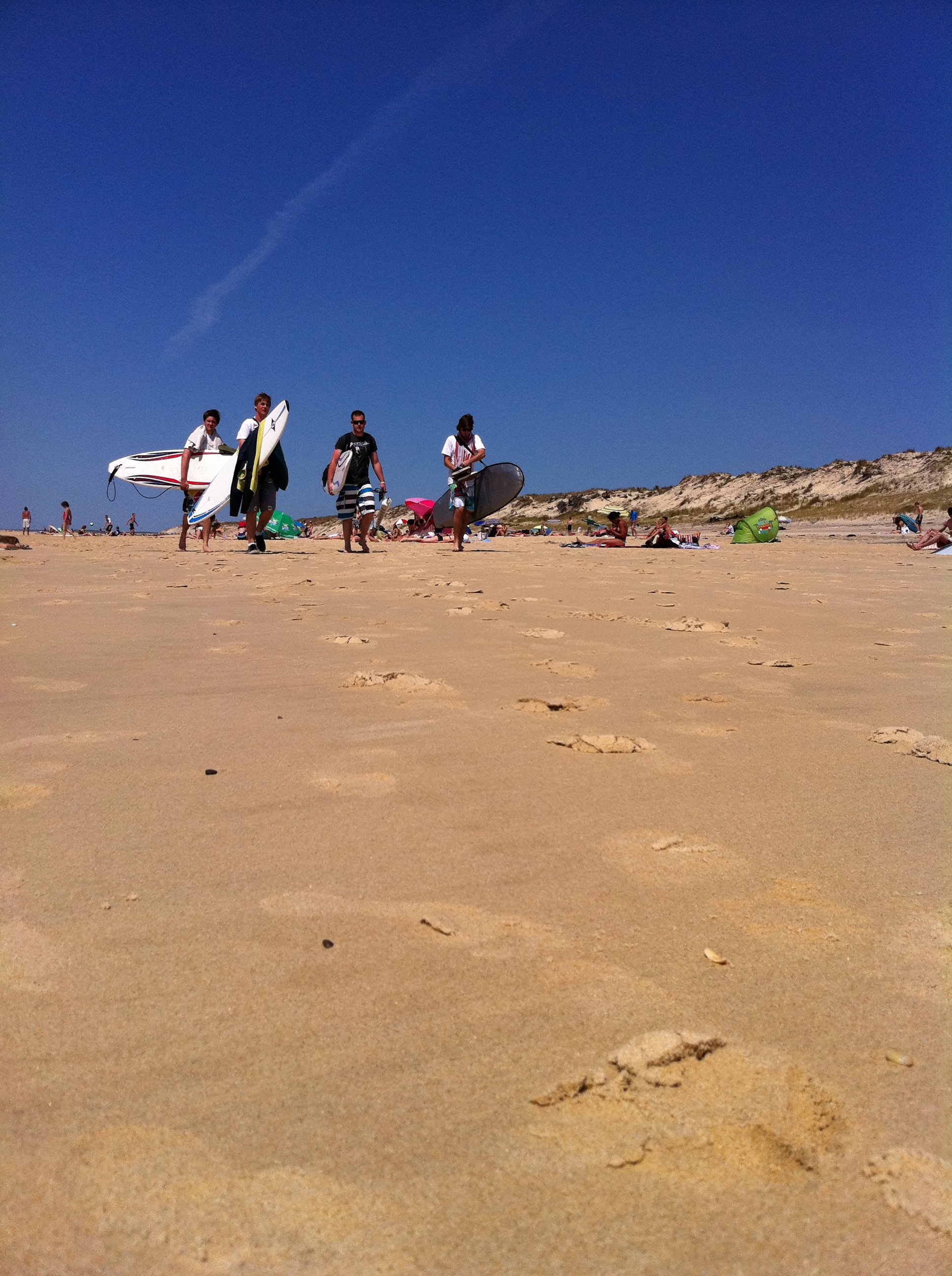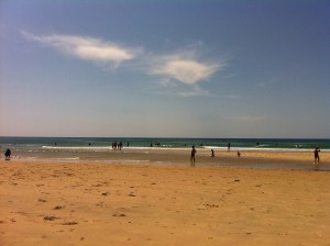 La plage est immense, toute en sable jaune, la mer semble monter. Elle est calme. Seules quelques vagues en bordure de rivage animent le tout. À la descente de la digue, il y a du monde, beaucoup de monde. Alors nous nous poussons sur la droite. Tiens, il n’y a plus personne. C’est louche, On aurait du se douter qu’il y avait un hic. Et oui, nous sommes dans le spot des surfeurs. Se prendre une planche dans la tronche quand on barbote, c’est moyen. Mais heureusement, au début, les vagues sont assez éloignées. Ils attendent, tels des Brice de Nice en puissance, assis sur l’eau. Personnellement, j’adore quand ils se lancent à 20 de front, chacun éloigné de l’autre de quelques centimètres. S’ils ne surfent pas dans le même sens, ils se plantent l’un dans l’autre assez rapidement. Ça m’a beaucoup amusée. Au moins autant que la pirogue hawaïenne conduite par une équipe de jeunes qui avaient vraiment l’air de s’éclater. Ils parvenaient à faire glisser l’embarcation entre quelques éclats de rire, les plus petits surfant debout sur le ballant. Aussi vu en Californie (à San Diego) et au Maroc l’automne dernier, les longues planches sur lesquelles se tient debout un pagayeur, tel un gondolier. Je ne suis pas encore convaincue de l’intérêt, mais ça semble amusant. Ça doit avoir un nom cette chose?