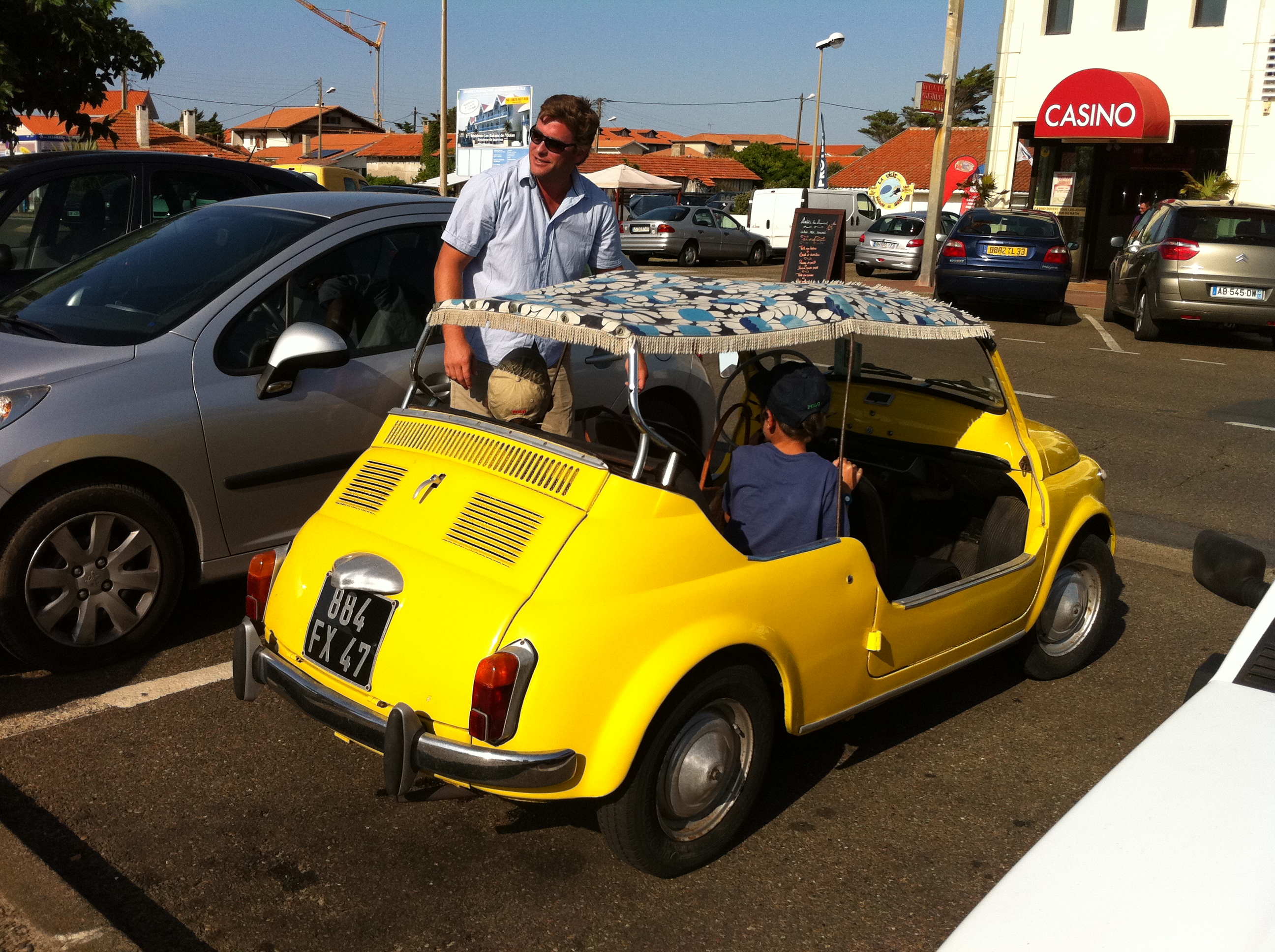 Trouver un stationnement, c’est du sport. On a tourné pas mal. Fred a réussi à glisser la voiture entre un panneau et une auto, dans une place de poche, avec 2 cm devant, et 1/2 cm derrière. Va savoir pourquoi, je lui ai passé le volant! Évidemment, deux minutes plus tard, on trouve un autre emplacement, à l’ombre de surcroit. Et hop, changement de place.
