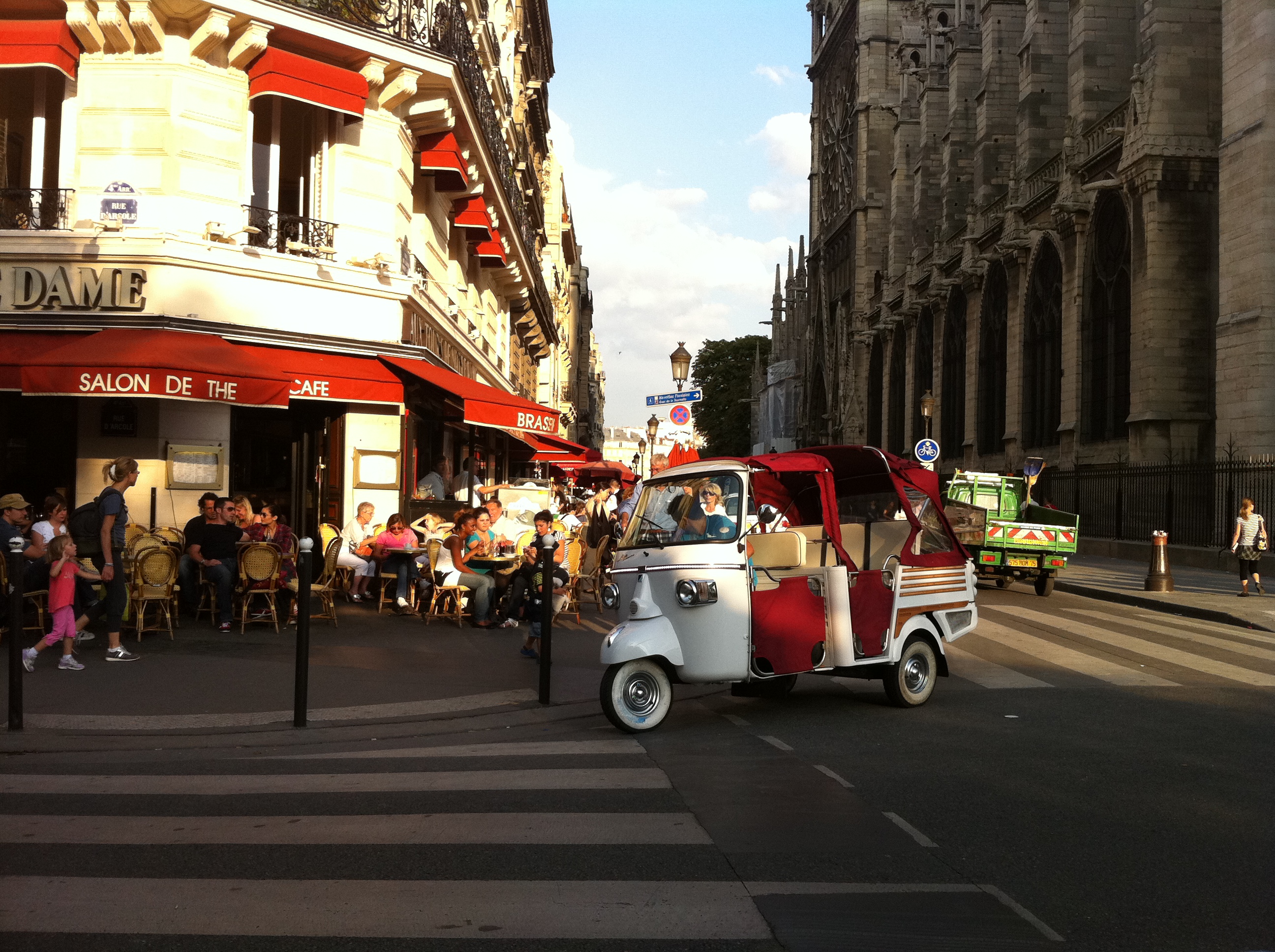 Finalement, après une bière bien méritée, nous sommes parties vers des sites plus touristiques, histoire de montrer à Lumi des monuments ou peut-être quelque chose de plus accessible que la culture de rue. Direction l’Île Saint-Louis où Notre-Dame trône fièrement depuis sept siècles, 22 langues différentes entendues à la minute, des farandoles d’appareils photos, des bricoles faites en Chine à acheter en souvenir et des rickshaws – de luxe, de préciser Margaux qui arrive justement d’Inde. La version parisienne est de marque Piaggio et dispose de tous les attributs d’un véhicule européen – il me semble qu’on voit les mêmes dans les films italiens des années 60.