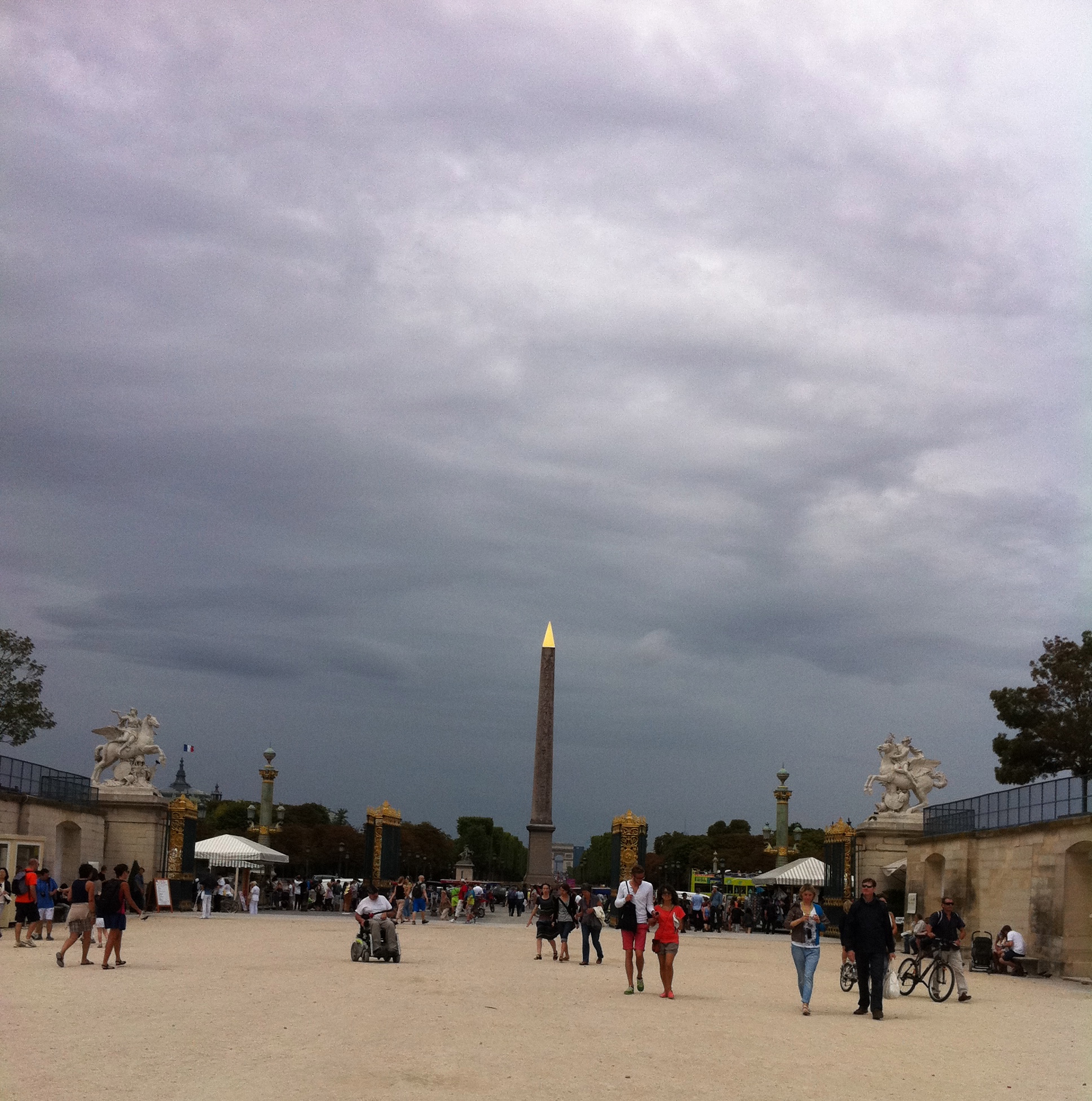 Nous voilà devant la Concorde, l’entrée des Tuileries. Le ciel s’assombrit, le sommet de l’obélisque brille de tout son or dans le ciel noir. Les filles se posent devant le bassin, puis mues par un sixième sens peut-être, on se met à bouger rue de Rivoli. Je cherche l’Apple Store pour faire débloquer mon iphone. Oui, encore des marques, diront les lectrices de mon manuscrit! Là, le cauchemar commence. La température décline de minute en minute, et il se met à mouillasser. Une espèce de bruine fraîche comme tout. Les touristes se mettent à l’abri sous les arcades. Ils attendent leur bus… de touristes, en troupeau, sur le trottoir. Passer au travers tient de l’épreuve. Parapluie à droite, grognement à gauche. Ils sont compactés, préoccupés par la perspective de rater l’autobus ou pire, se tromper de véhicule.