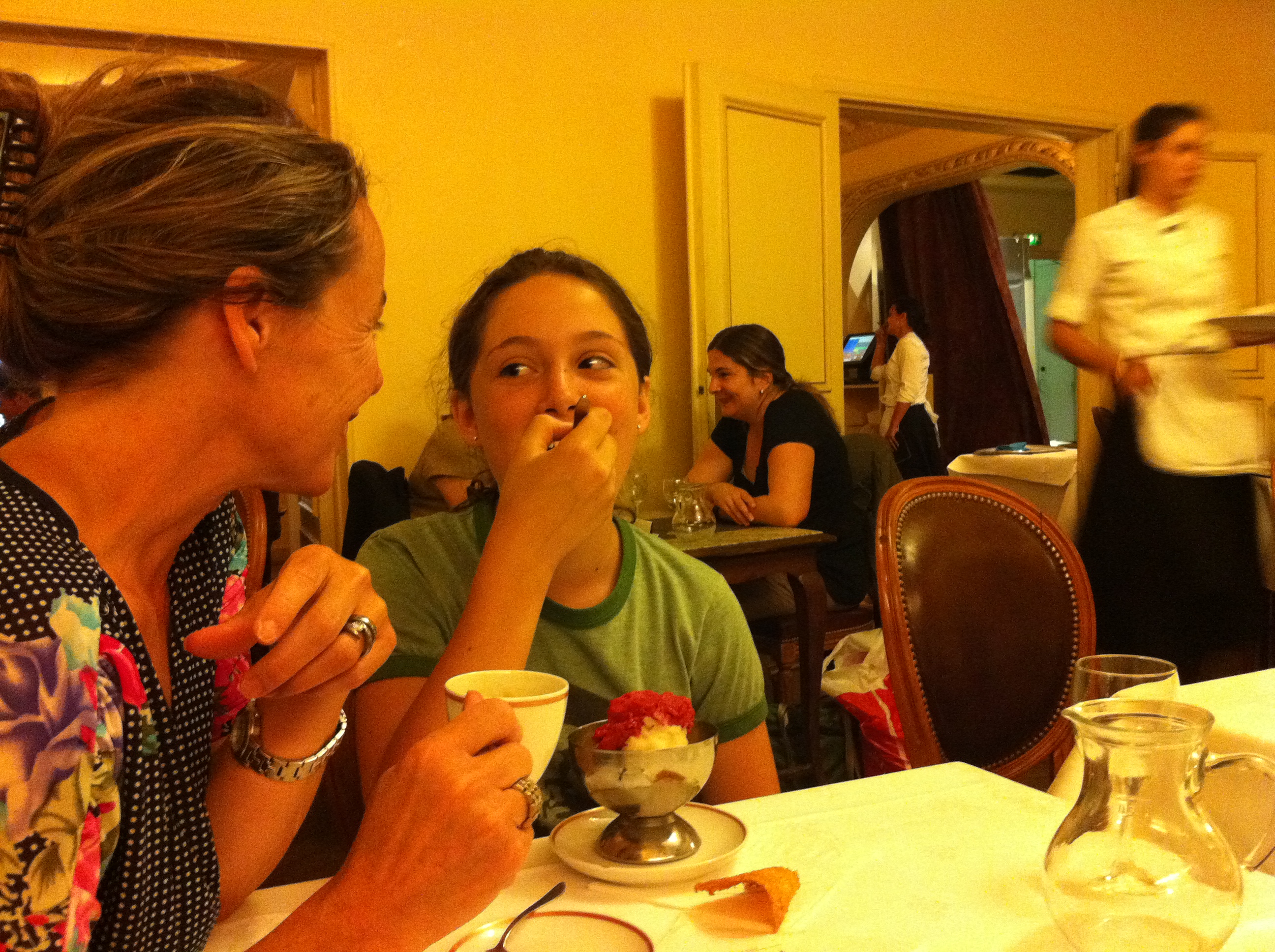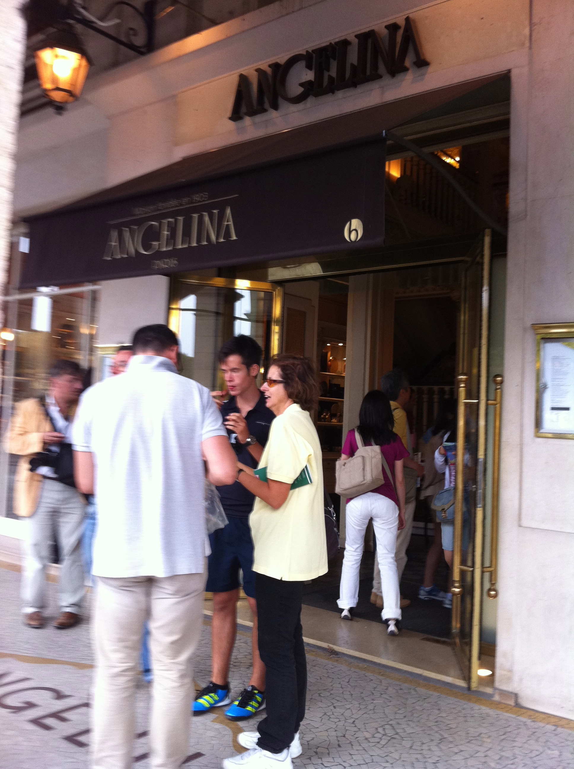 J’ai oublié Angelina… Comment ai-je pu? Mais oui, forcément, rue de Rivoli, nous sommes passées devant chez Angelina, haut lieu du chocolat chaud – la cuillère tient droit dans la tasse tellement il est riche – et du macaron (plusieurs préfèrent Ladurée, mais on ne sait jamais où le snobisme se place!). Lumi réclame un chocolat chaud, l’endroit est étonnant de serveurs guindés et de touristes japonais. Finalement, et pas mal d’euros plus loin, ma fille prendra un sorbet trois boules (10 euros, n’essayez pas de convertir, c’est indécent). Nous les grandes opterons pour un espresso (4 euros – aaaahhhhhh) et une orange pressée (7 euros). J’ai pensé au sketch de Gad, j’ai souri, ça ne vaut pas la peine de paniquer.