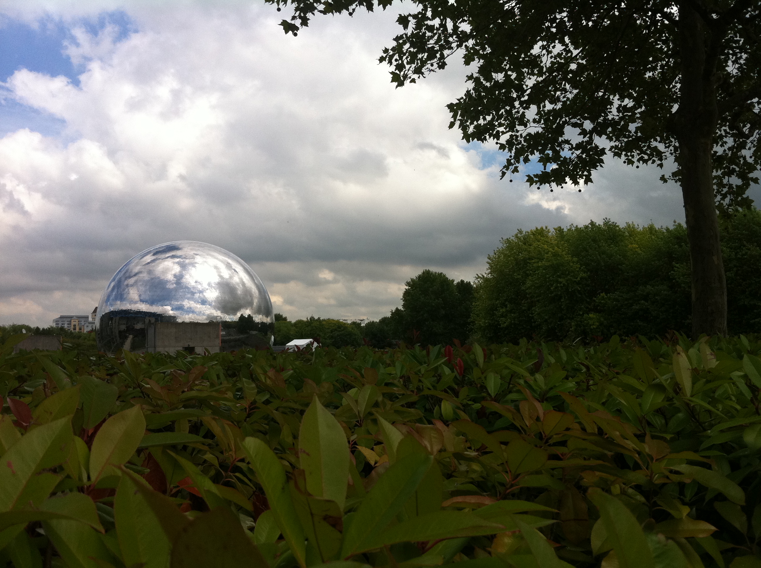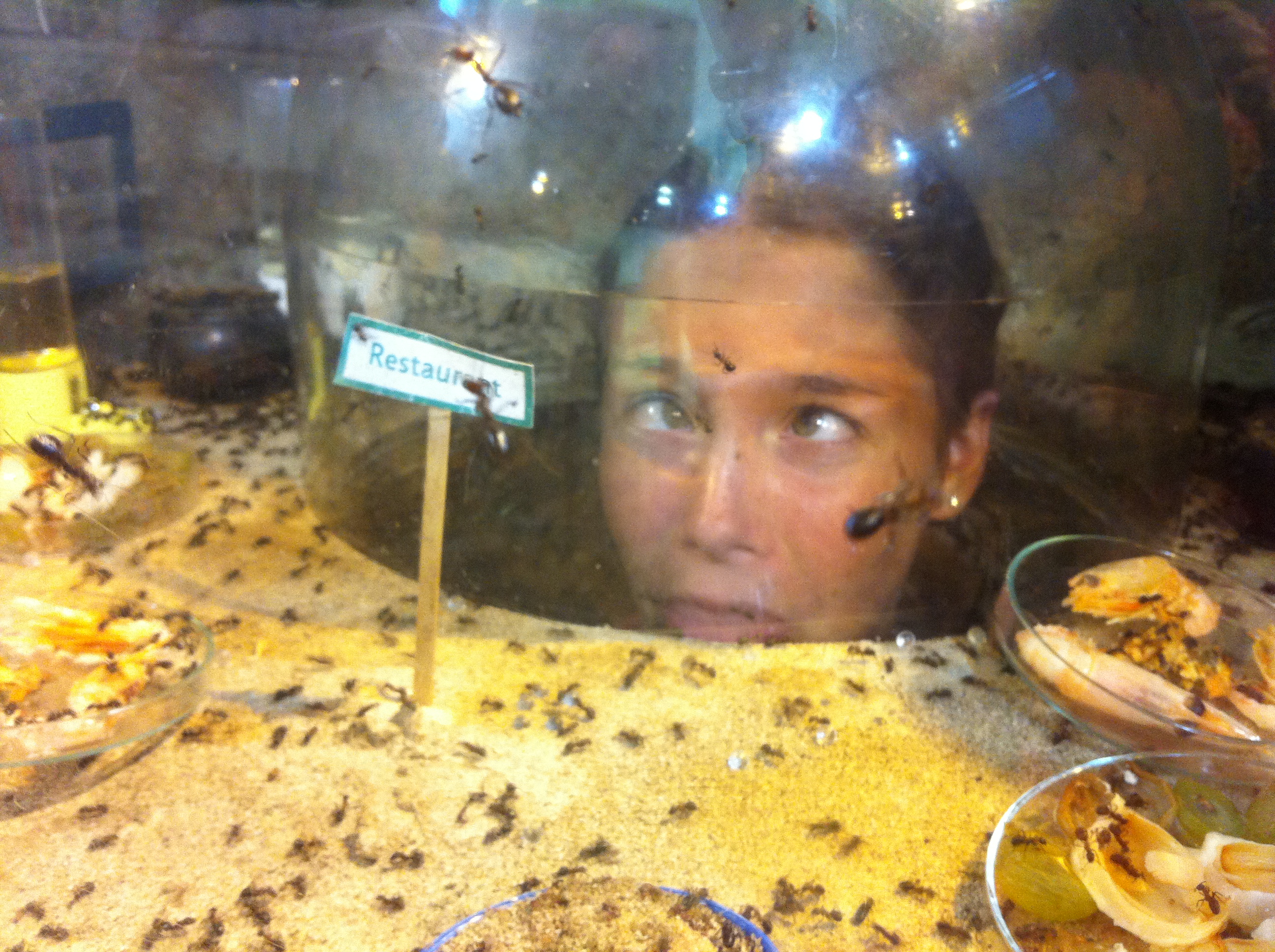 Après une bonne demie heure de marche, on parvient derrière la splendide et spectaculaire Géode brillant de mille feux dans la lumière orageuse de l’après-midi. Évidemment, il y a une longue file d’Attente à la billetterie, mais bon, voilà c’est comme lorsque l’on prend l’avion, on sait que l’on va attendre, alors autant prendre son mal en patience tout de suite. Le point positif, un jeune homme s’arrête auprès de chaque personne pour préparer les billets en faisant des suggestions et des recommandations. Au milieu des nombreuses choses à faire, nous avons opté pour l’expo Explora et la Cité des enfants. Notre gentil guide avait laissé entendre que ça ne nous laissait pas beaucoup de temps pour l’exposition très très riche d’Explora. Et bien, il avait raison. En fait, Explora, c’est une dizaine de minis expos scientifiques. La première sur les gênes était extrêmement sophistiquée et d’un niveau très soutenu. Margaux avait étudié certains des sujets à l’Université. Résultat, nous avons immédiatement perdu Lumi carrément dépassée. Nous avons réussi à la récupérer un peu avec l’expo sur les effets optiques, perspective et effets de décor l’ont accroché. Un atelier formidable sur les odeurs et saveurs l’a bien branché aussi, mais nous avons du quitter pour nous diriger vers la Cité des enfants.