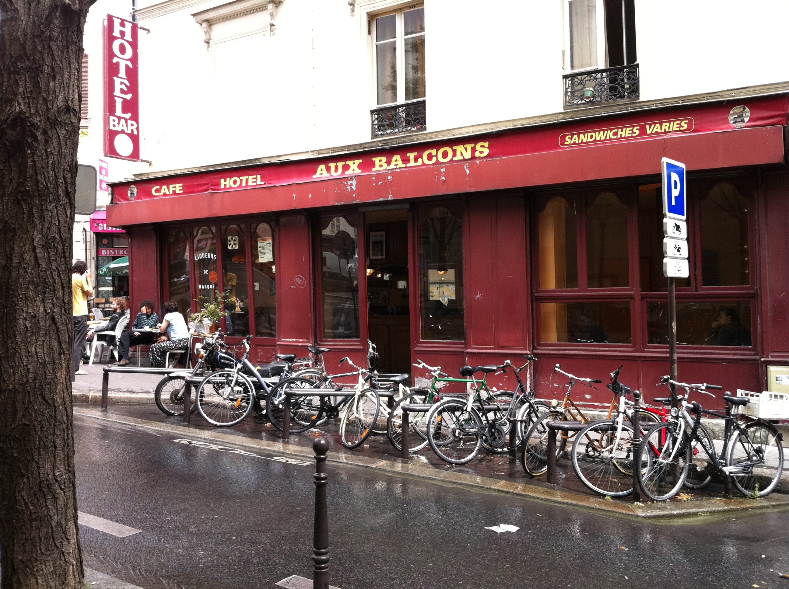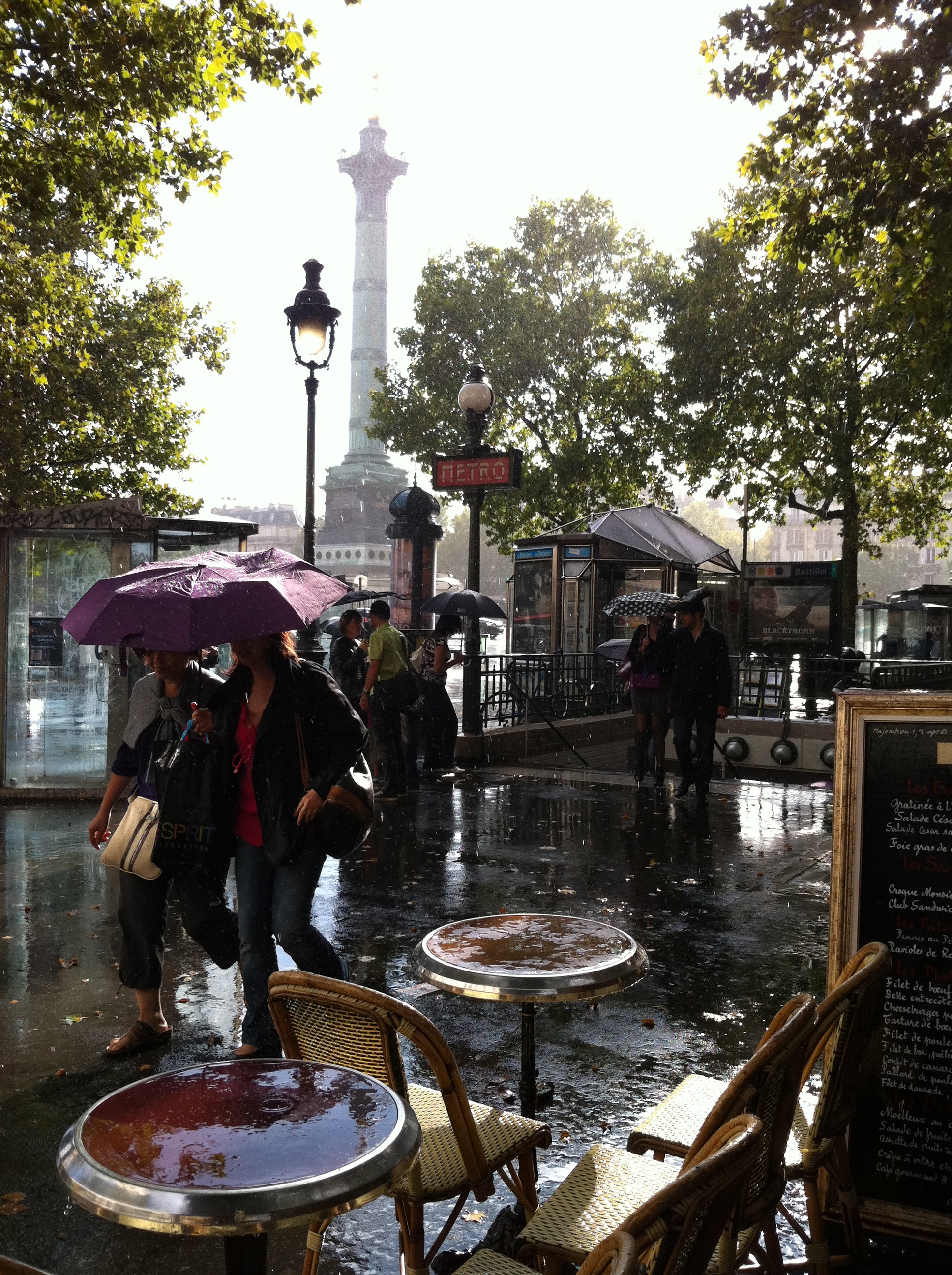 Mortes de fatigue, nous avons retrouvé Margaux à la fermeture de La Villette. Notre plus grand problème à ce moment-là étant de trouver un resto. On a aimé Bastille, hier, allez, on y retourne avec la ferme intention de ne pas retourner au même endroit. La sortie du métro a été épique : une foule agglutinée à la sortie Rue de la Roquette et les vêtements détrempés de plusieurs nous ont laissé supposer qu’il pleuvait assez sévèrement. Effectivement, un déluge accueillait tous les téméraires qui s’aventuraient dehors. Effet étrange, on voyait les reflets du soleil sur le mur de la maison en face. Finalement, on se décide, pour se réfugier rapidement sous un parasol du Bastille, le bistro d’en face. Il pleut à boire debout sous un grand ciel bleu ensoleillé.