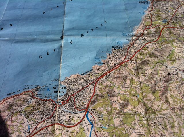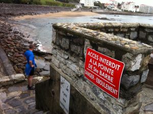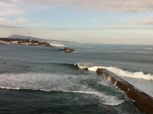 Et formidables journées nous avons passées. Reçus par mon vieux copain F. – pas si vieux, nous avons le même âge, mais on se connaît depuis la 2nde (sec. 5) – son américaine et généreuse épouse et leurs trois énergiques gaillards, nous nous sommes posés au bout de la digue dans la maison familiale. Le grand-père avait trouvé LE spot idéal, face aux vagues, loin des touristes. Même les voitures ne passent pas. Quand le bruit des rouleaux nous réveille le matin, on ouvre les volets et la baie de St-Jean-de-Luz s’étend à nos pieds. Quelle vue, non? Socoa, en face avec son fort, bastion de l’UCPA.