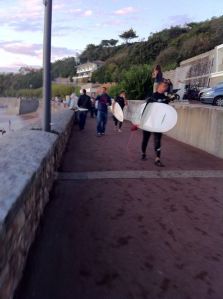 Mais St-Jean-de-Luz est aussi, avec Biarritz, puis Hossegor et Lacanau plus au nord, un bastion du surf français. En ce week-end de Toussaint, les vagues étaient paraît-il exceptionnelles (autour de 3 mètres/ 9 pieds) et l’affluence de surfeurs… proportionnelle (d’autant que Biarritz accueillait un championnat monopolisant les rouleaux locaux). De 40 courageux qui sont allés attendre leur vague dès 8h le matin, ils étaient plus de cent en moyenne tout le reste de la journée. « Je ne crois pas avoir jamais vu ça » dira F. comptant et recomptant d’un bout de jumelle, les points noirs qui flottaient. « 112 », hurlera-t-il à un moment… malgré la marge d’erreur.