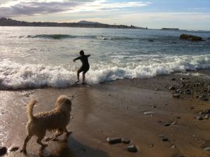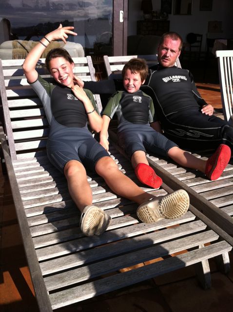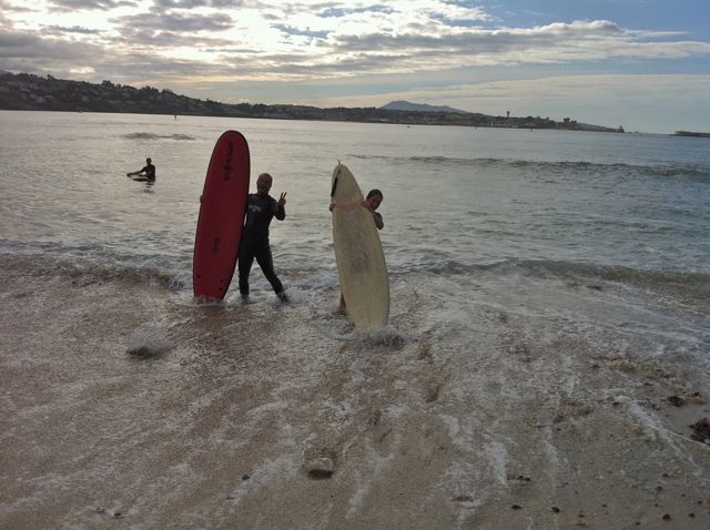 la tribu n’est pas restée sur le rivage – sauf moi qui ai paresseusement glandé au soleil – et est allée tenter sa chance sur les vaguelettes en buvant avec plus ou moins d’eau au passage. Reste que mamzelle était vachement fière d’elle, et que le petit bonhomme a quand même été un peu beaucoup trop secoué. Le père lui, est parvenu à glisser deux fois sur les genoux. Ils ont tous hâte de prendre un cours.