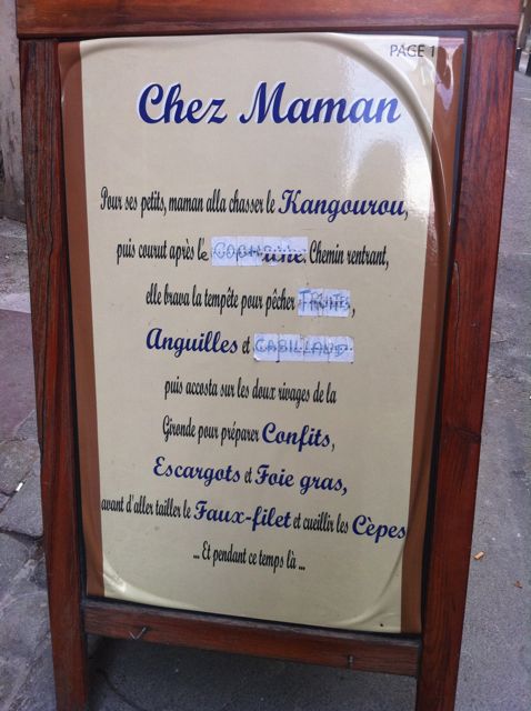 J’avoue ne pas encore avoir compris le concept derrière la carte de ce restaurant: Maman part y chercher du kangourou… Pourquoi pas?