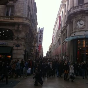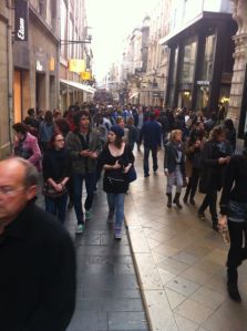 Là, le délire a commencé. Amis montréalais, vous n’avez pas idée de ce qu’est la rue Ste-Catherine bordelaise un samedi après-midi. Prenez le défilé de la Saint-Patrick sur 1,4 km, augmenter le nombre de passants, évitez le vert et ajoutez la gueule que la plupart tire parce qu’ils n’ont pas du temps envie d’être là… Je crois ne pas avoir vu autant de monde dans un si petit espace depuis fort longtemps. Et je ne vous dis dans les magasins, là, il m’a fallu beaucoup d’imagination et une bonne humeur implacable pour rigoler d’une file d’attente de vingt minutes (Zara) et une quasi file aux escaliers mécaniques (H&M). Après… personne ne m’a forcé à magasiner un samedi après-midi non plus. Ce qui m’a permis de faire des traits d’esprit avec ma voisine de patience et même avec la caissière, bien contente de recevoir un peu d’empathie.