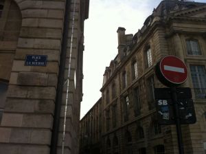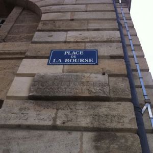 Une pensée pour les Indignés sur la Place de la Bourse, un sens interdit de toute évidence. Sous la pancarte moderne et actuelle, les deux appellations précédentes apparaissent gravés dans la pierre : « Actes des autorités constituées » et surtout « PLACE DE LA LIBERTÉ »… amusant.