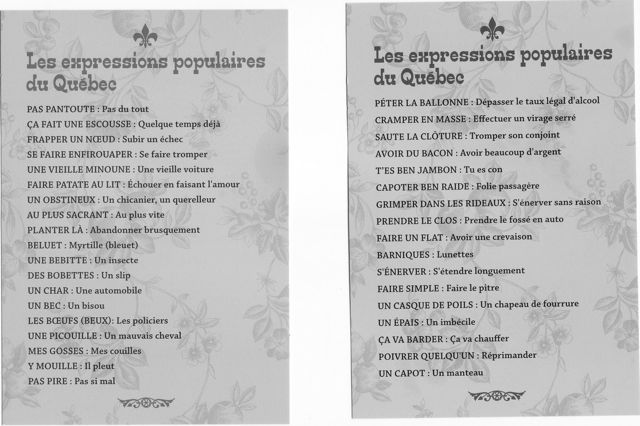 ah cette liste… je crois surtout que les Québécois qui ont prononcé ces soient-disant expressions devant les auteurs du tableau se sont bien fichus de leur gueule!! commentaires: