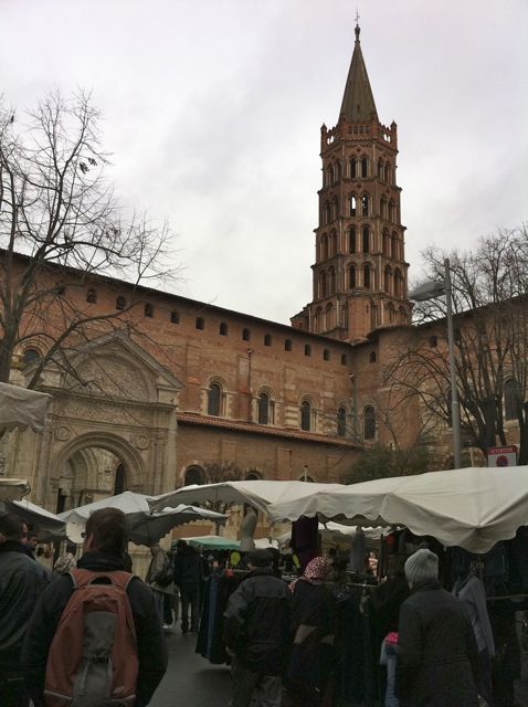 Au bout, on arrive aux pieds de l’étonnante et magnifique Basilique Saint-Sernin. Sauf qu’aujourd’hui, c’est marché. Pas une succession d’étals de fruits et légumes, non un marché comme des Puces, comme celui de Wazemmes (pour les Lillois). Un truc de fous qui grouille comme la Tour de Babel, qui bouge au rythme des familles qui s’y pressent, qui sent la chèvre des cuirs et le mouton des laines, qui fume le kébab. On est au coeur de Marrakech, de Dakar. Il y a des étals de tout, des commerçants professionnels et des gens du coin qui vendent leurs trucs et autres bricoles extraites du grenier. C’est le bordel. Pour nous qui débarquons de notre bout de rang, c’est le dépaysement total. Je ne croyais même plus que ça existe.