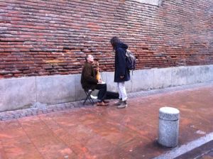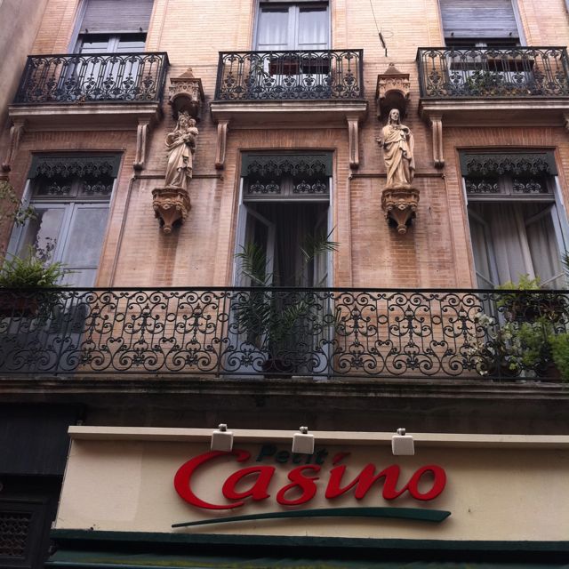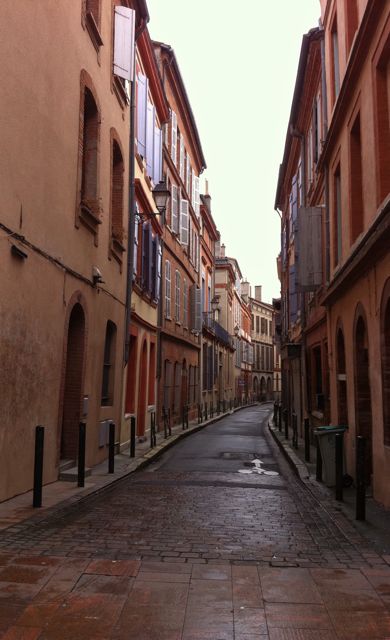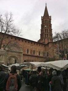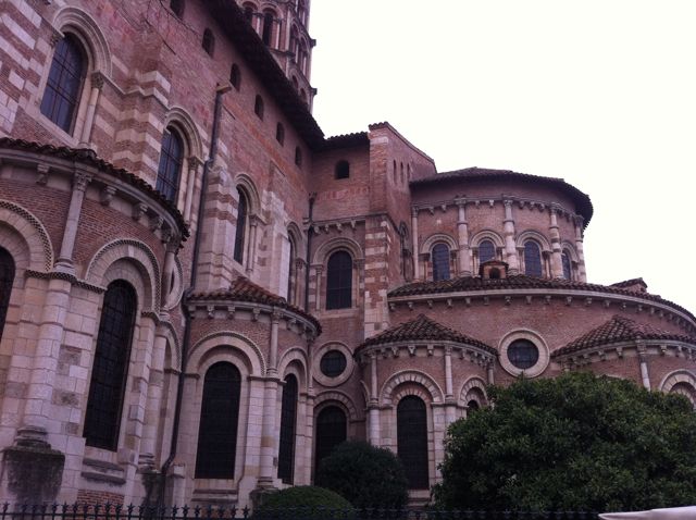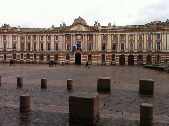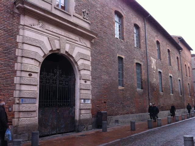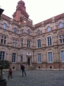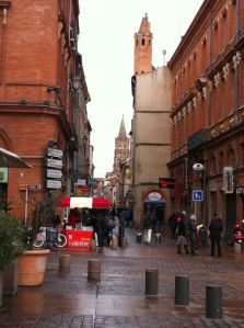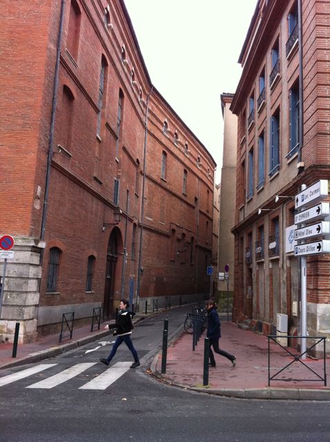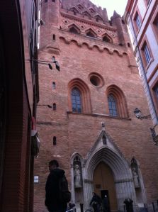 Nous avons suivi la rue Taur (piétonne), sommes passés devant l’Église Notre-Dame du Taur, impossible à photographier par manque de recul. Premiers constats, c’est dimanche, mais il y du monde dans les rues. On est au coeur d’une ville multiéthnique. La plupart des maisons sont en brique, et c’est vrai, elle semble rose tellement elle est associée à d’autres teintes ocre, rouge, jaune safran. L’influence des Maures se ressent. Partout des rues étroites s’agrippent pour partir en courbes. Certains bâtiments sont tellement austères – la bibliothèque universitaire ressemble à une prison – qu’ils laissent présumer des chaleurs estivales.