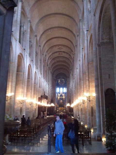 À un moment, j’entends de l’orgue. Fred me traite de folle, comme j’entends des voix ces temps-ci, je ne peux pas lui donner tort a priori. Je prends mes petits par la main et nous entrons dans la Basilique… Une envolée d’orgue nous accueille de plein fouet. À peine éloignés du kébab, ça fait contraste. J’ai failli éclater en sanglots tellement l’émotion était puissante. Bon, il faut dire que les lieux ne sont pas mal non plus…. D’ailleurs, autre anecdote, Fred nous attendant devant l’entrée, voit arriver une famille de quatre personnes aux visages de type arabe. Deux jeunes femmes sont voilées. Elles s’arrêtent à sa hauteur, enlèvent leur voile, les rangent dans leur sac et… toute la famille entre en souriant.