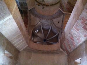 La réponse à l’énigme : Le petit rond est le sommet du clocher… vu de l’intérieur. Donc je regarde le toit/plafond de la Basilique.