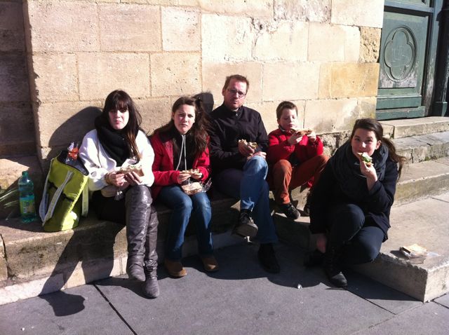 promenade dans Bordeaux, ville morte. Et oui, en France, tout est fermé le dimanche ! Pique-nique sur le parvis de l’église Saint-André, puis cinoche.