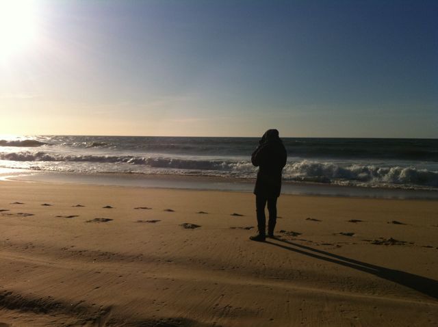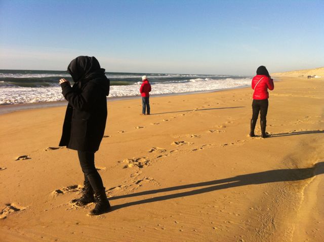 sur la plage, les rouleaux s’enchaînent. Les quelques surfeurs se gèlent avec ardeur… nous aussi.