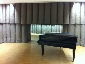 Un galériste a demandé à un artiste de créer une oeuvre pour décorer sa galerie alors entourée de travaux urbains majeurs, en Allemagne je crois. Le créateur a insonorisé le lieu avec de gros rouleaux de feutre. Vraiment gros. Regardez les proportions à côté du piano à queue. Quand on entre dans la pièce qui reproduit son projet, il n’y a plus un bruit. On se sent dans un cocon, j’oserais presque parler d’utérus : c’est chaud, amorti, confortable. Il y a quelque chose de troublant dans ce ressenti intuitif. Rien de réfléchi là-dedans.