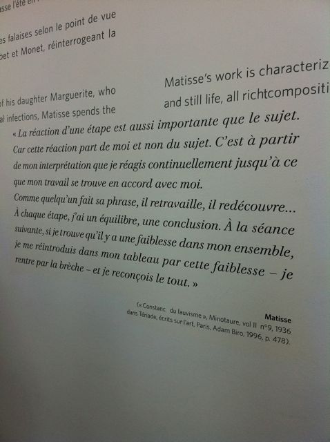 Ne me demandez pas pourquoi ça me parle tellement. Peut-être parce que c’est la première fois que je comprends un plasticien qui s’exprime sur son oeuvre. La plupart du temps, soit ils ont beaucoup de difficultés à traduire leur art en mots, soit ils sont la proie des analystes (journalistes et autres académiciens du visuel) qui se font une joie de rendre leurs textes incompréhensibles. Matisse est simple, clair, lumineux… Un artiste à taille humaine.