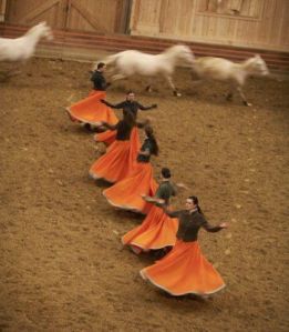 Les enchaînements se succèdent avec leur cavalerie Puis une séquence surprenante. Des chevaux entrent sans entrave. Pendant quelques minutes, ils galopent sans monture, sans harnachement. En toute liberté – feinte ? – ils se roulent dans le sable. Le blanc immaculé de leur robe se tache. Puis ils s’apprivoisent, se lèvent l’un contre l’autre avant de partir en volte. L’un court, l’autre lui cède la place. Magique. Est-ce travaillé ? Le fruit du hasard ? Puis les quatre écuyères s’installent au milieu. Telles des derviches, elles se mettent à tourner sur elles-même. Les chevaux entrent dans une danse folle et virevoltent autour du manège. Magique. Cette séquence à elle seule traduit toute la science de Bartabas. Pour lui, le cavalier fait corps avec sa monture et n’impose rien. Elle suit.