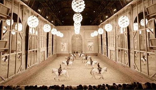 Après un passage en attente dans la salle orange Hermès – oui, la marque du sellier et du it-bag Birkin – on entre dans le manège officiel. Une structure de bois entièrement démontable. Des longues banquettes basses couvertes d’un coussin peu épais. Des loges aussi, au dessus. De chaque côté de la « scène » en sable, d’immenses miroirs recouvrent les murs. Ils sont accrochés comme des ponts levis relevés. Les lustres enfin. D’immenses boules constituées de feuilles lumineuses. Un espace hors temps.