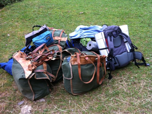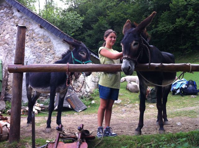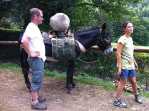 Les règles de Petits pas sont rigoureuses : pas plus de 40 kg sur l’âne. Petit contretemps, nous avions prévu deux ânes, pour finalement n’en prendre qu’un. Au moment de partir, changement de paquetage donc et rapide passage de quatre à deux sacs de bât. Christine et Patrick, les sympathiques propriétaires du troupeau, nous regardent faire de loin. Trois randos partent en même temps et les ânes ont des fourmis dans les pattes. Finalement, nos sacs sont prêts : 40 kg sur l’âne (équipement de camping, préparatifs de repas et nourriture), plus un petit sac à dos chacun avec nos affaires personnelles, casquette, lampe de poche, couteau et gourde. Jusqu’au chien qui porte ses croquettes, ce qui lui a valu un franc succès auprès des autres marcheurs!