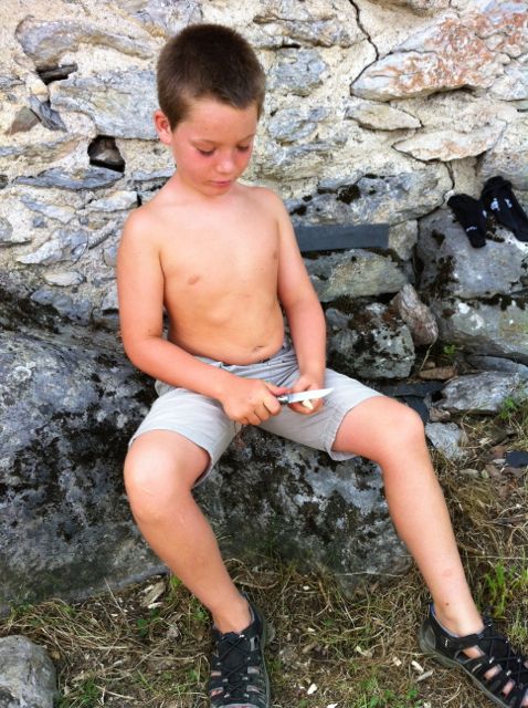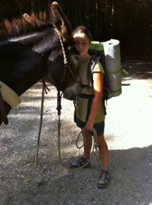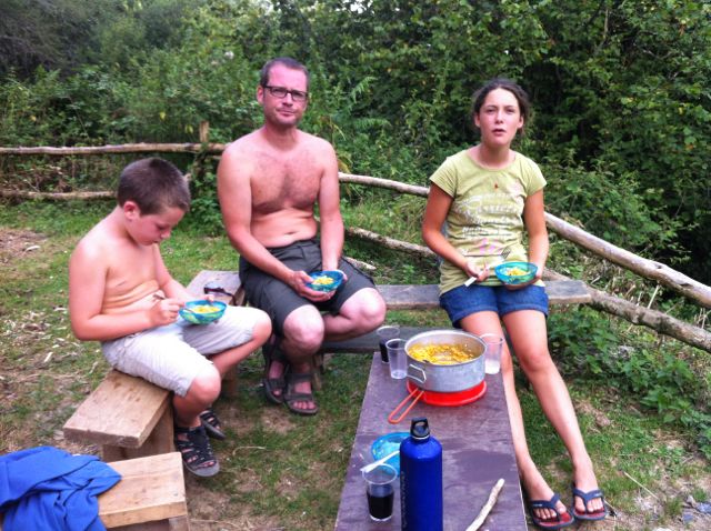 Dès le premier jour, nous développons notre routine : marche tranquille, pause collation, marche, lunch, marche jusqu’au lieu où l’on passe la nuit. Installation du campement, recherche d’eau potable, souper/dîner. Les enfants montent alors sur l’ânesse et la prennent pour une ponette. Jeux de société, yam’s en particulier, vu qu’on ne connaît aucun jeu de cartes – il va falloir améliorer cet aspect parce que franchement, cinq soirs de yam’s… – et dodo.