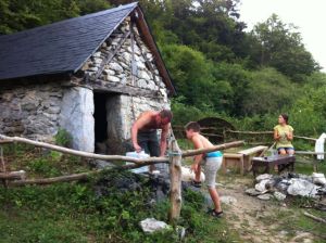 Comme elle est disponible, nous dormirons dans la cabane. Rudimentaire à souhait : deux bancs, une table qui se sortent autour du feu de bois. Un large plateau de planches fixé à 70 cm du sol. Nous disposerons nos tapis de sol et les sacs de couchage pour la nuit. À mon grand âge, dormir sur une planche n’est pas de tout repos. J’ai les hanches qui flanchent, le cou tordu, les côtes qui grincent. Pour faire court, mon capital sommeil était un peu galvaudé au réveil. En trois nuits, j’aurais repris l’habitude de dormir n’importe où, et je me réveillerai sans une ride de travers.