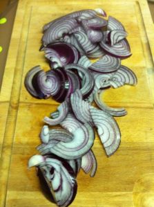 Il vous faut des cuisses de canard confites (en conserve, ça le fait très bien), des oignons (rouges, les meilleurs), des pommes (croustillantes et sucrées), des feuilles de chou frisé.