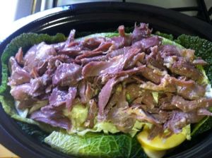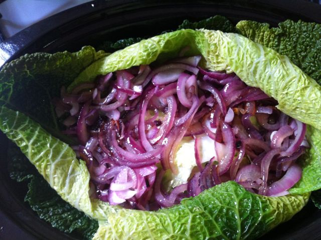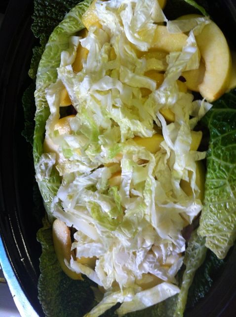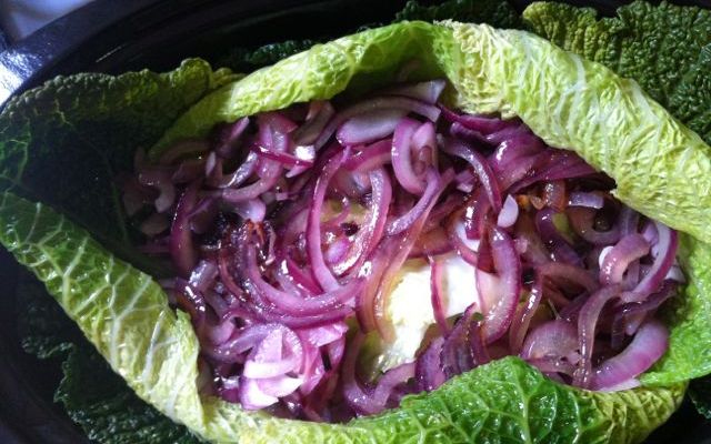 Blanchir les feuilles de chou. Faire fondre les oignons d’abord, puis les pommes tranchées, dans le gras du confit de canard. Dépiauter le canard (un sale boulot de mec, ça). Et après, vous mettez les feuilles de canard blanchi dans un plat allant au four. Ajoutez les oignons fondus. Puis les pommes. Des feuilles de chou ciselées. Et bien sûr, le canard dépiauté. Tout ça en étages, bien sûr. Refermer sous des feuilles de chou et hop, au four. 30 minutes, ça me paraît bien.
