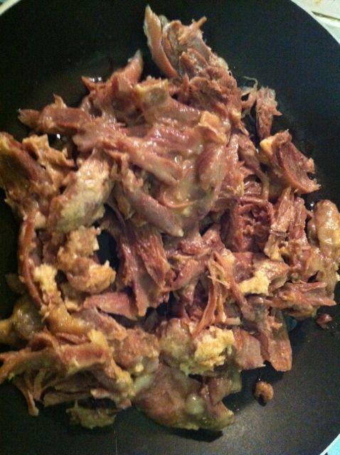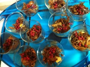 – préparer les verrines : déposer des miettes de canard dans le fond.