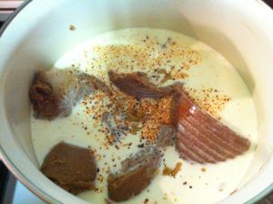 – faites chauffer à la casserole les châtaignes, la crème et le lait; assaisonner, puis blender/ mixer et faire refroidir.