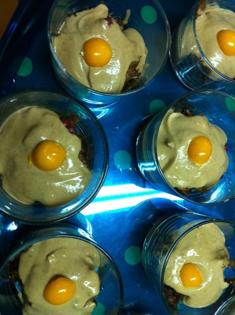 En vrai, j’ai complètement raté mes verrines au confit de canard et mousse de châtaigne. Sauf qu’elles étaient très bonnes, alors ça compense leur look indécis. Auquel s’ajoute une couleur franchement improbable, uniquement due au bleu du plateau.