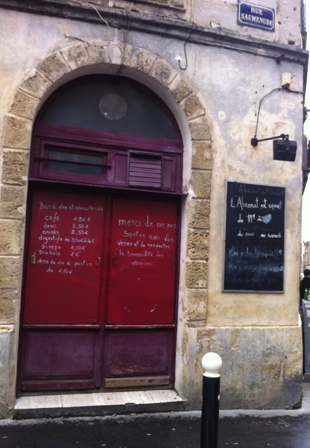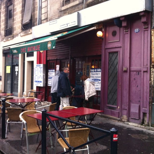 Devant nous, le marché des Capucins. À droite, Chez Mathilde : bavette + frite + 1/4 rouge, 10 euros. On entre.