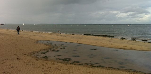 Aujourd’hui, l’automne est avancé; Quinze degrés affichés malgré un vent frais qui ferme les manteaux, ajuste les chapeaux. Nous marchons sur la grève. Mes talons et mon dos en vrille m’interdisent le sable. La mer est basse. Peut-être le souvenir des déambulations sur les plages du Nord. J’aime la mer.