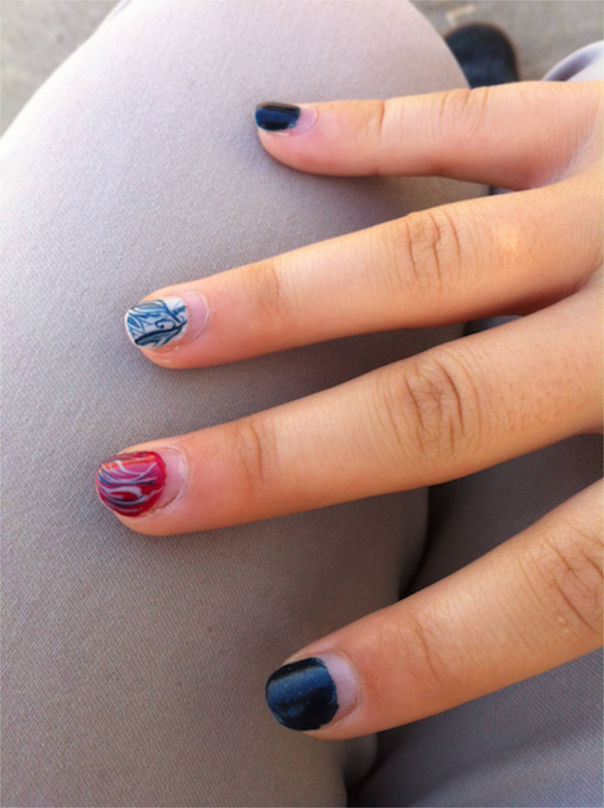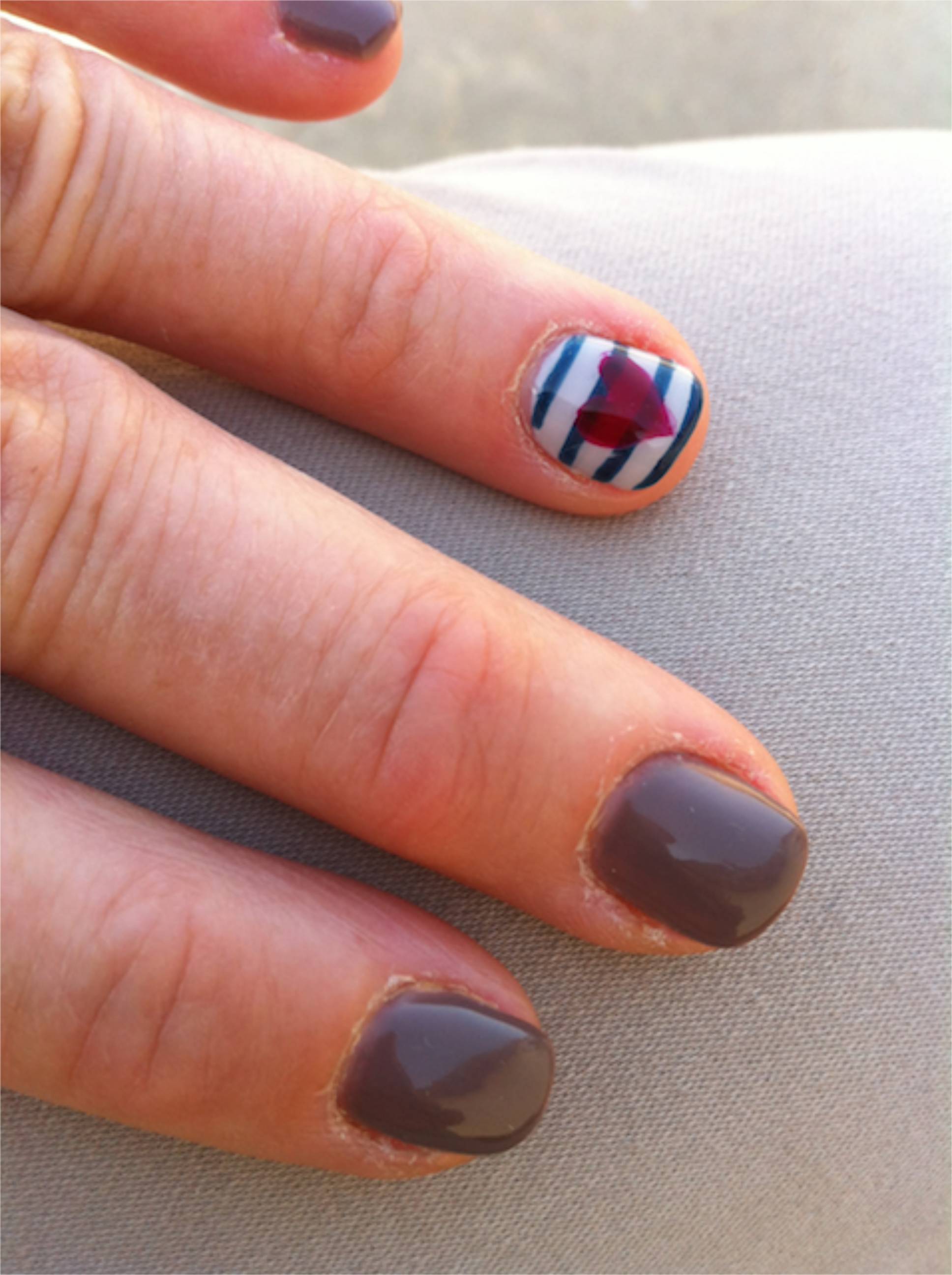 Toujours à l’affût des nouveautés « beauté », elle est arrivée un jour avec des ongles de quatre couleurs différentes : taupe, rouge, bleu, et Jean-Paul Gaultier. Si je vous le dit. Un doigt par main était à rayures bleu et blanc, avec un coeur rouge. Waouh. À l’heure du nail art, ça n’étonne presque personne, sauf moi. Trois semaines après, son vernis tenait toujours : la magie du Shellac.