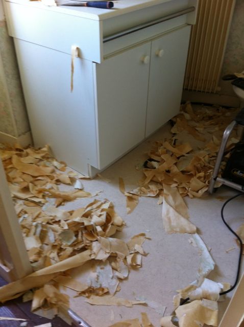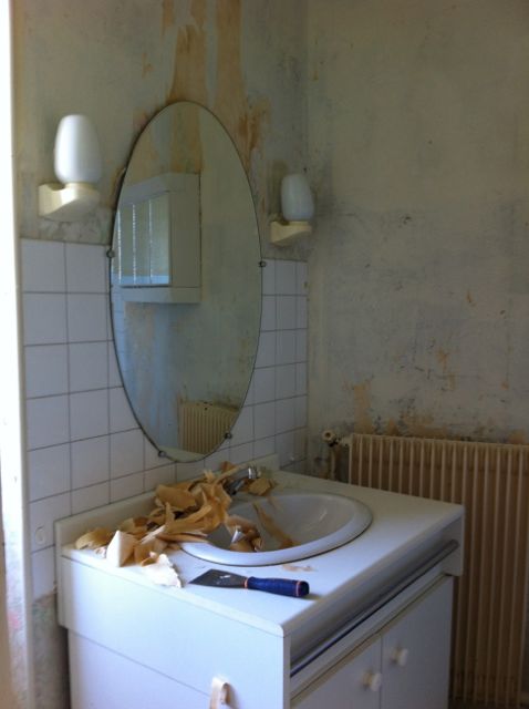 Quand il fait 34°C à l’extérieur, je vous laisse le soin d’imaginer le bonheur à manipuler une décolleuse à papier peint qui envoie de la vapeur (de l’eau à plus de 100°, ignorants) dans un couloir en U. Façon étuve. Comme la douche était bonne, après.