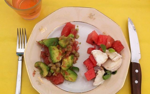 mes salades estivales : avocat/pamplemousse/crevettes, et pastèque/féta (ici, chèvre)/basilic. Rosé Ventoux.
