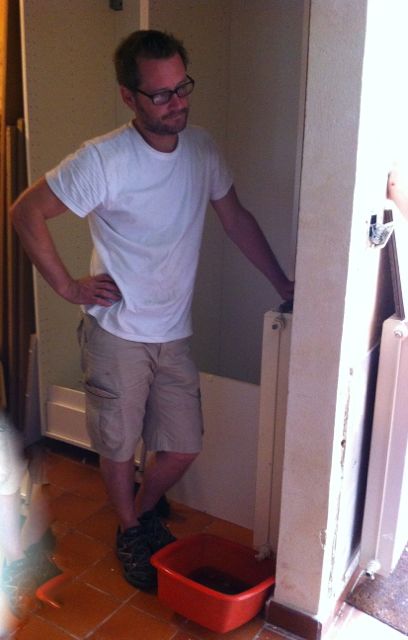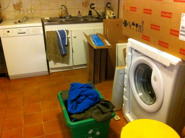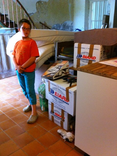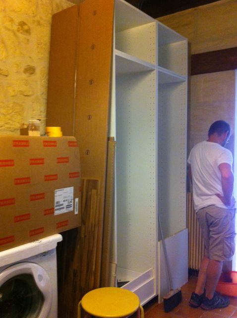 mais avant l’installation définitive: Tétris géant, live. J’explique. En bas, une fois le radiateur enlevé, on poussera les caissons de cuisine, on déplacera aussi les machines à laver le linge et la vaisselle; puis, le frigidaire trouvera sa place à gauche de la gazinière, et là, et uniquement là, on pourra installer notre vaisselle et le garde manger. Ouais. De l’espace. Enfin le bonheur. On pourra déballer les meubles, se croire dans une vraie cuisine « américaine », attenante au salon et à la salle à manger.