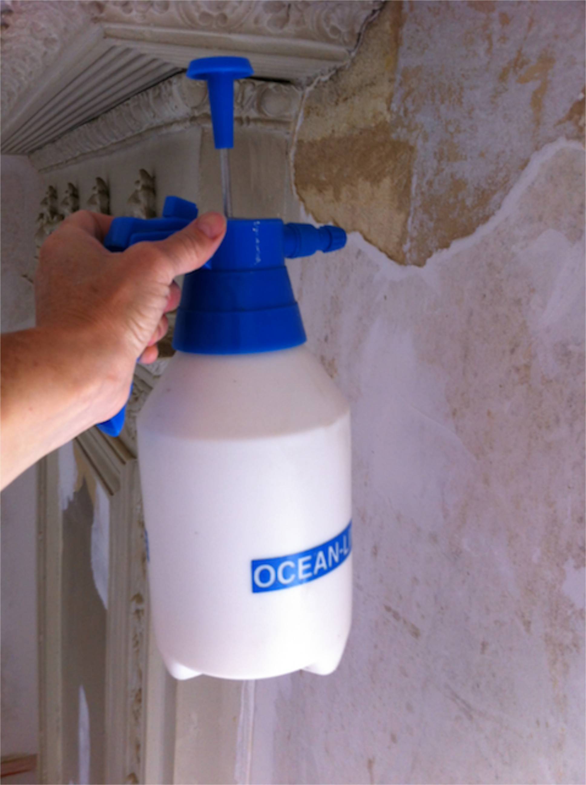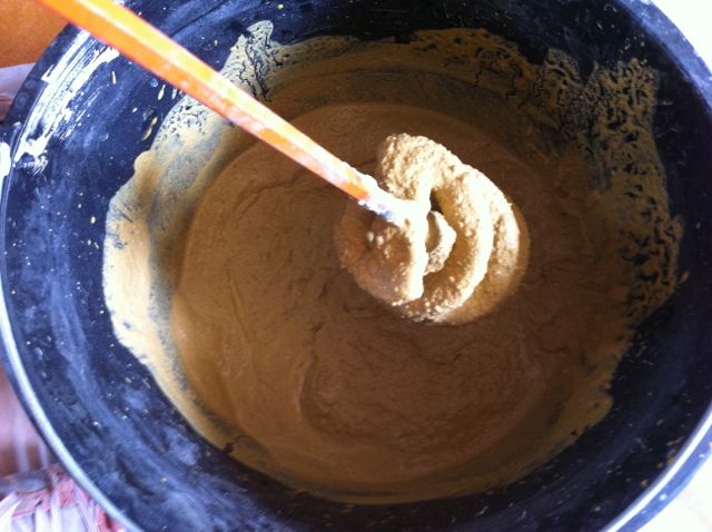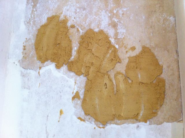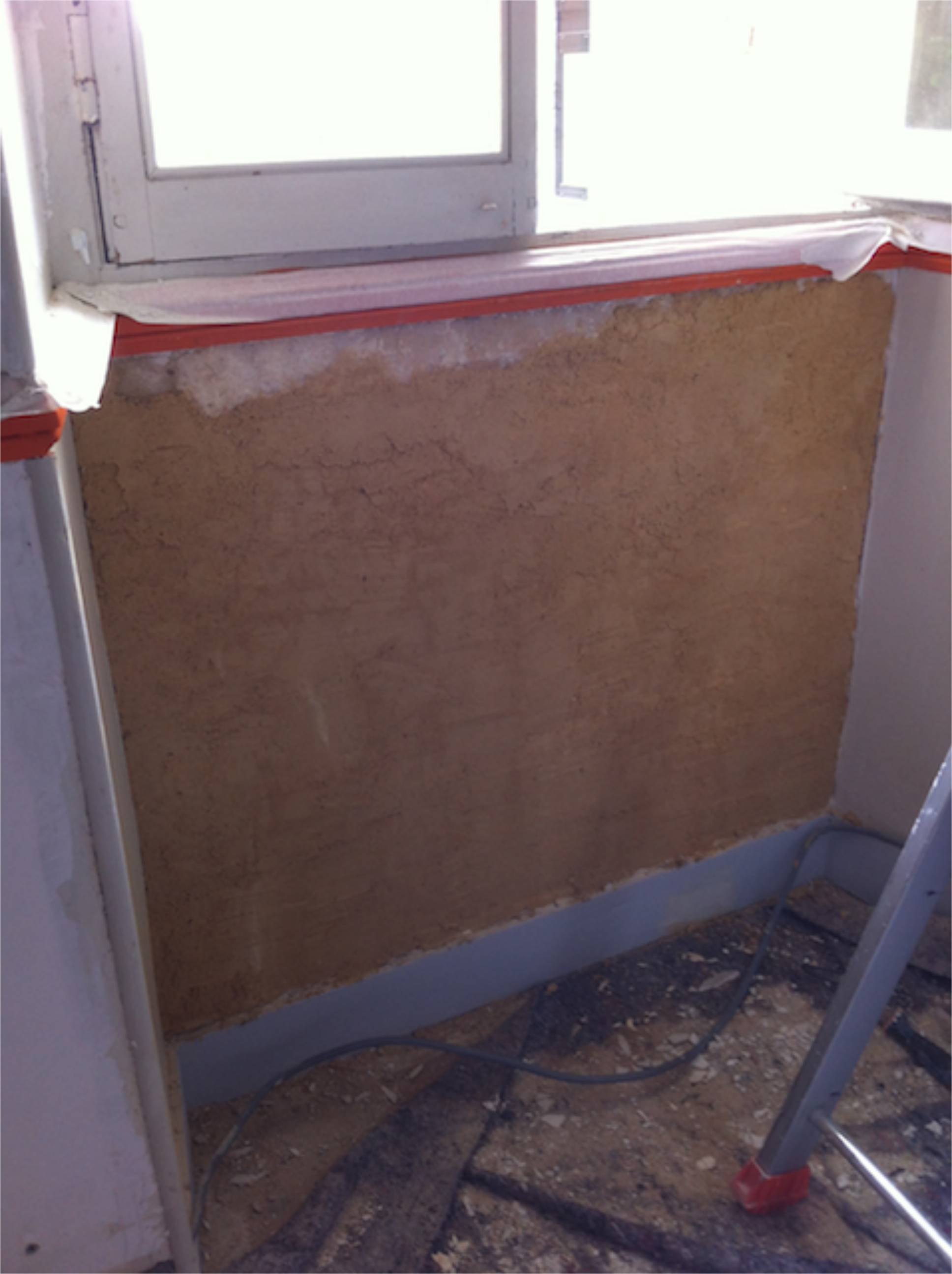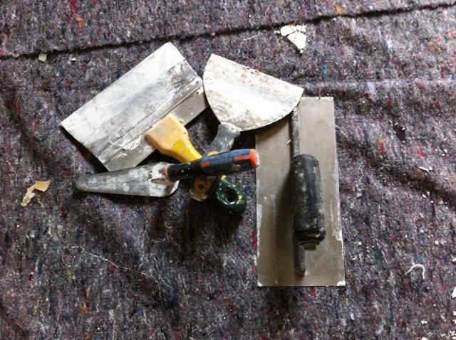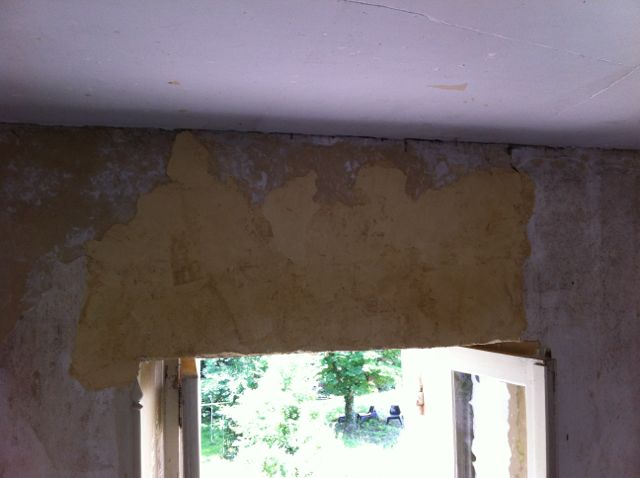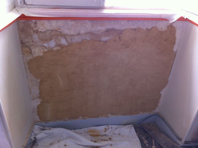première étape : le mélange. Une patouille de chaux et de sable. 1 pour 3 et tous pour 1. Essayez donc de poser de la pâte sablée sur un plan vertical… plouch, plotch, splatch… 2e étape donc, balancer cette espèce d’enduit sur tous les espaces desquels le plâtre – trop humide – est tombé. Une tuerie, en deux minutes, il y en a partout, sauf sur les trous à reboucher.