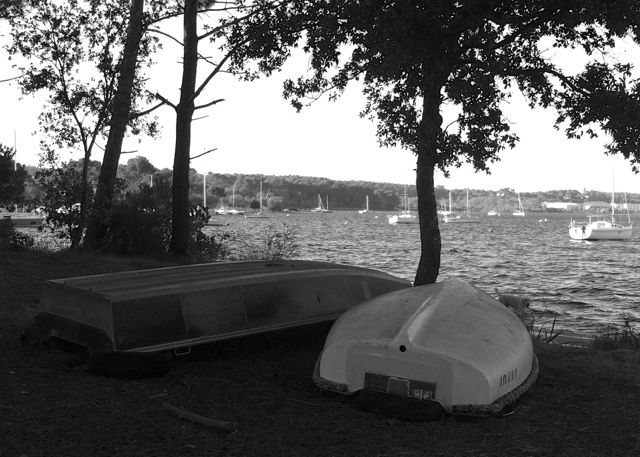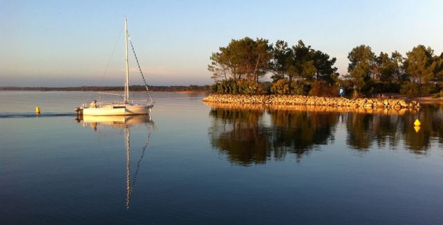 Pas un souffle de vent. Un voilier rentre au port au moteur. L’eau lisse réfléchit.