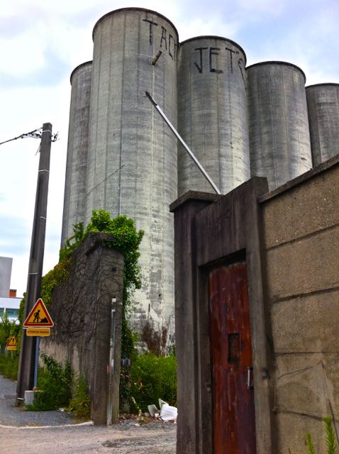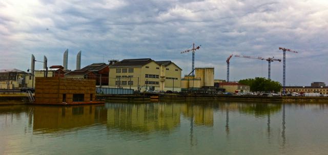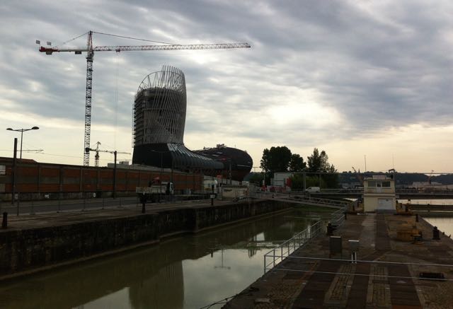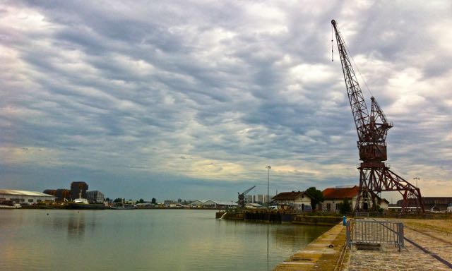 J’aime bien les zones encore industrielles, en cours de réhab’. Une cure de jouvence -plus ou moins réussie- pour quartiers mal famés. Le Bassin à flots est en transe. Champ de grues, tours qui poussent. Là-bas, une grosse botte ? Non, une carafe, un décanteur. Normal pour la future Cité du vin !